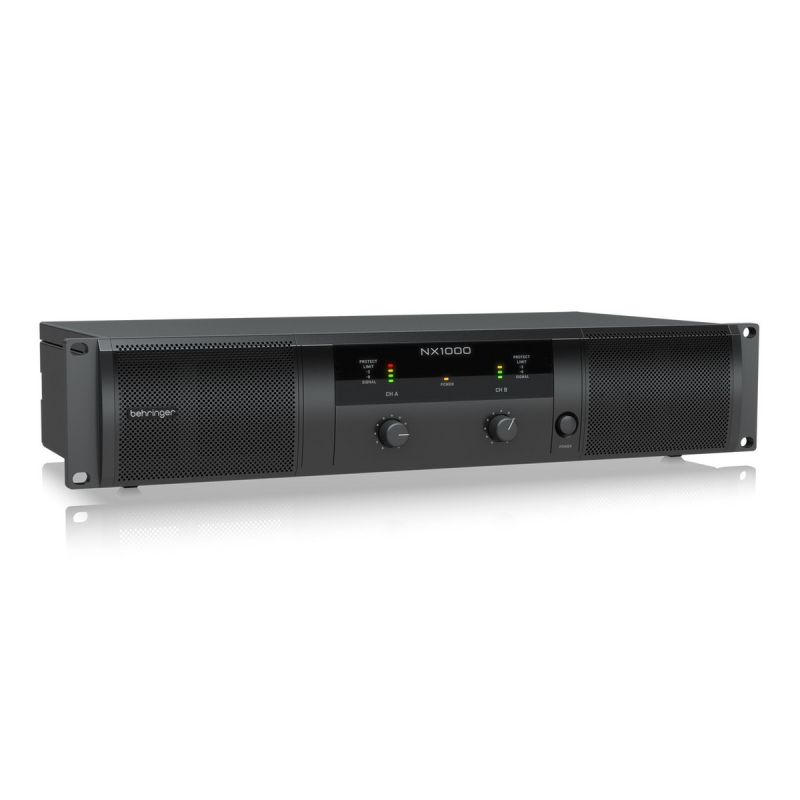 The Behringer NX1000 Power Amplifier features a two channel design and delivers a maximum output of 1000 watts into 4 ohms (bridged), as well as 2 x 500 watts into 2 ohms and 2 x 300 watts into 4 ohms. The rear panel of the NX1000 power amp offers two XLR and 1/4'' TRS combo input connectors, along with two professional-quality twist-lock speaker connectors. The detented and illuminated gain controls ensure precise level setting whilst the 4-segment signal and limit LEDs provide at-a-glance monitoring.